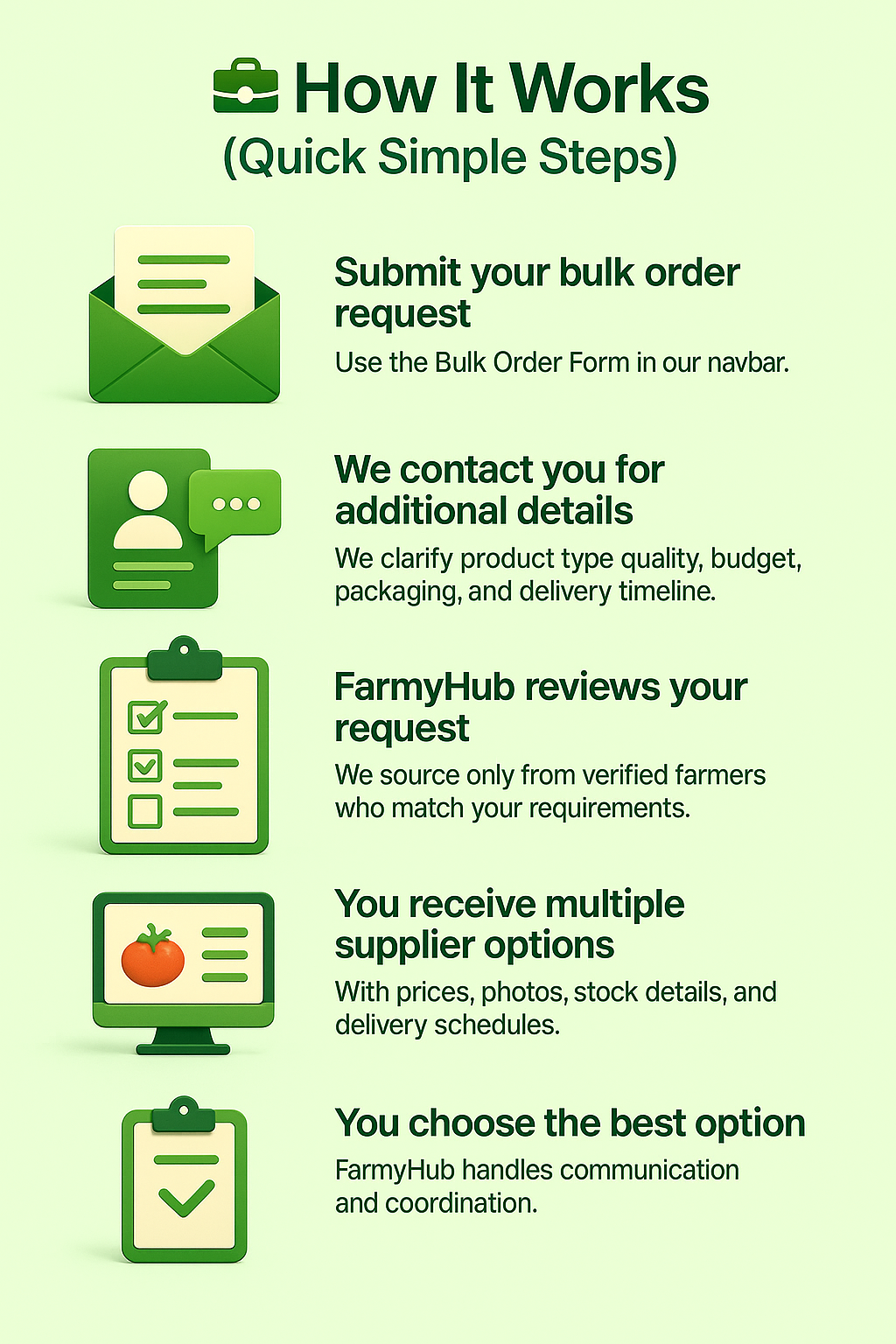 FarmyHub acts as your official sourcing and coordination partner, handling the entire process from finding suppliers to organizing delivery.